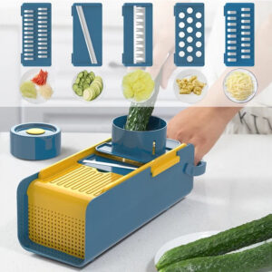 1.The versatile mandoline slicer combines 5 interchangeable blades: slicer, waffle cutter, chopper for thin and thick strips, julienne and grinder, ideal for hard and soft vegetables and Fruits such as carrots, potatoes, apples, lemons, onions, ginger, cheese, cucumbers, chips, salads